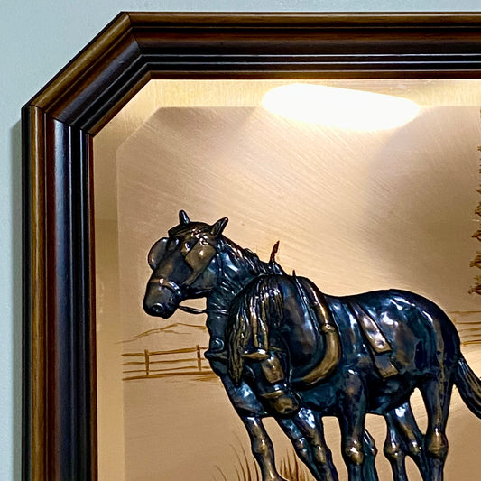 Vintage 3D Copper Wall Art Plaque Horse Farm Scene & Man Ploughing Signed Framed