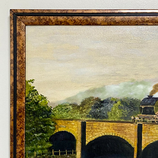 Vintage Flying Scotsman Crossing Bridge Oil On Board Painting Signed Routledge